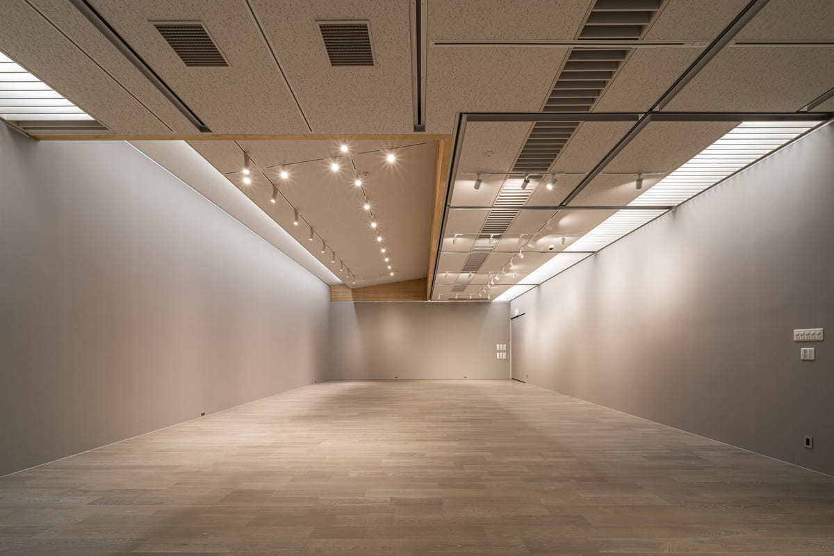 天井には四万十桧のルーバーをアーチ状に架構。照明・配線などの機能を内包しながら、吸音性・調湿性を高め、展示空間としての集中力と余白を両立している。