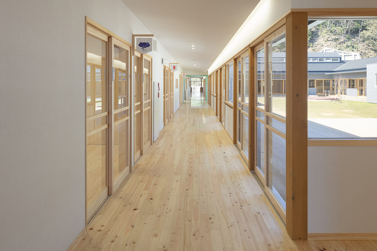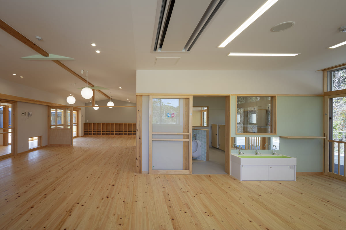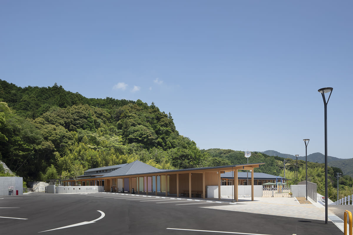 この園は、南海トラフ巨大地震による津波被害を見据え、海沿いに点在していた複数の保育所を統廃合し、内陸の高台へと移設された。単なる建替えや移転ではなく、地域全体の未来と向き合い、こどもたちの育ちと暮らしを支えるために生まれた“あたらしい郷”である。