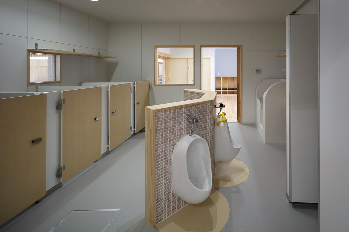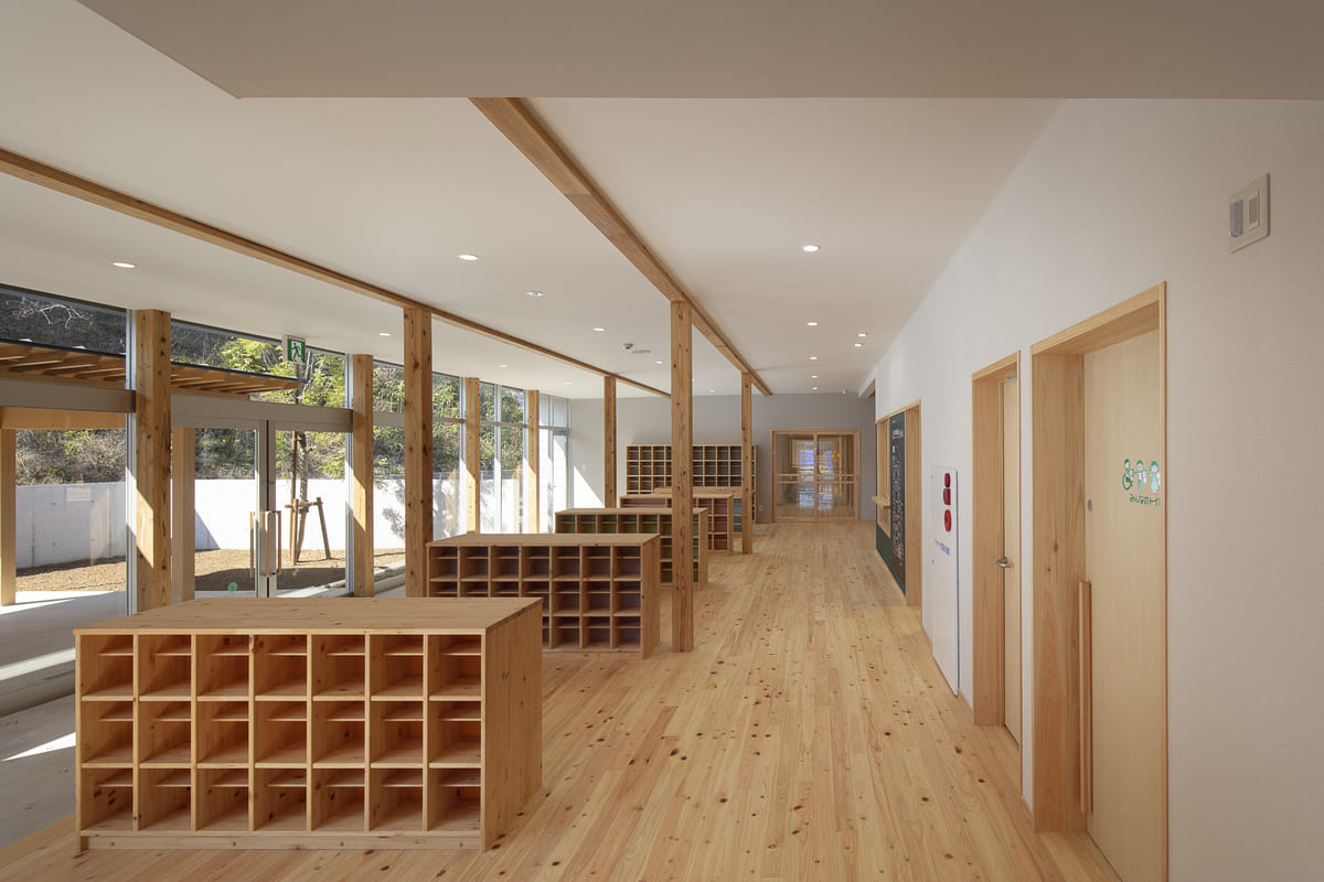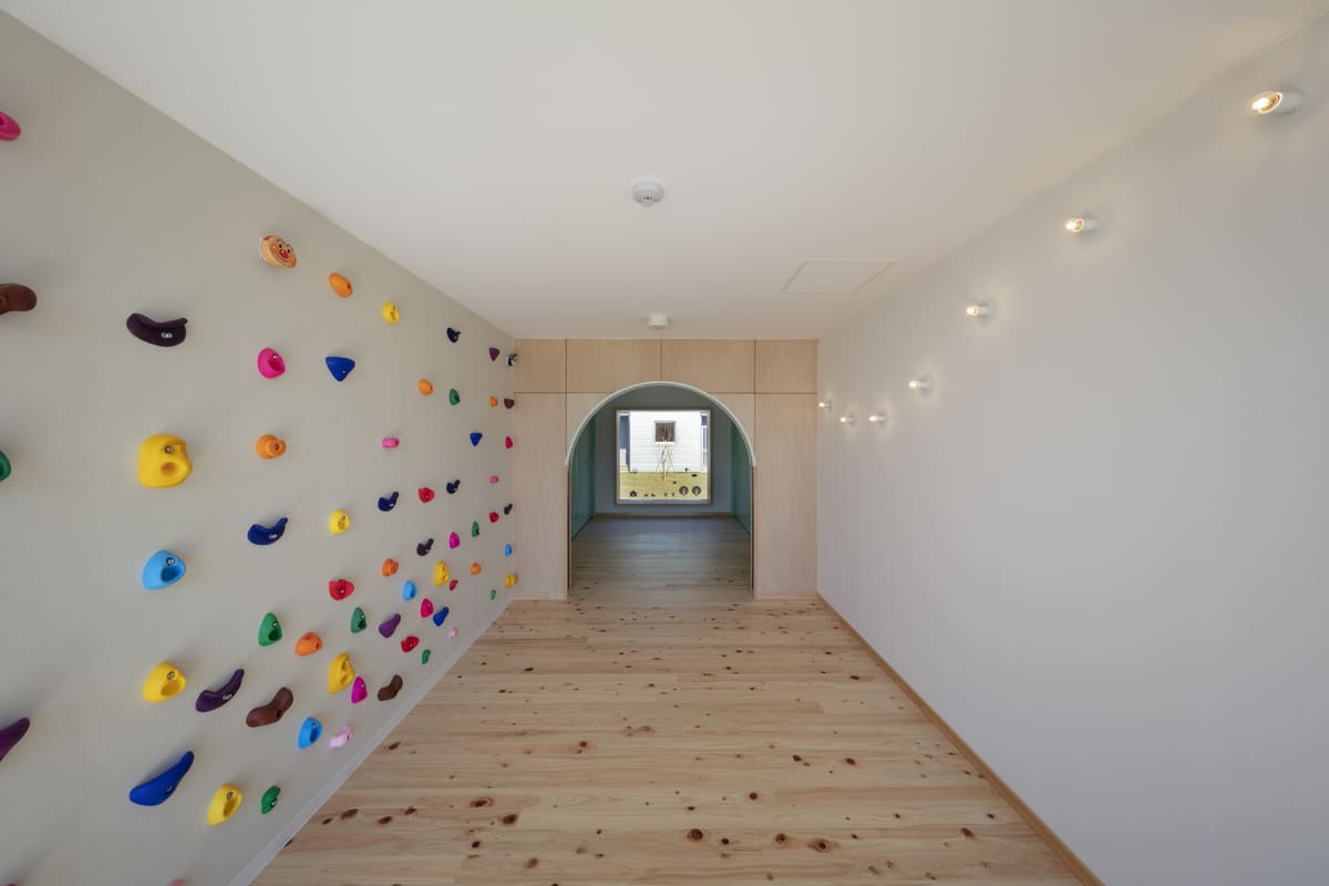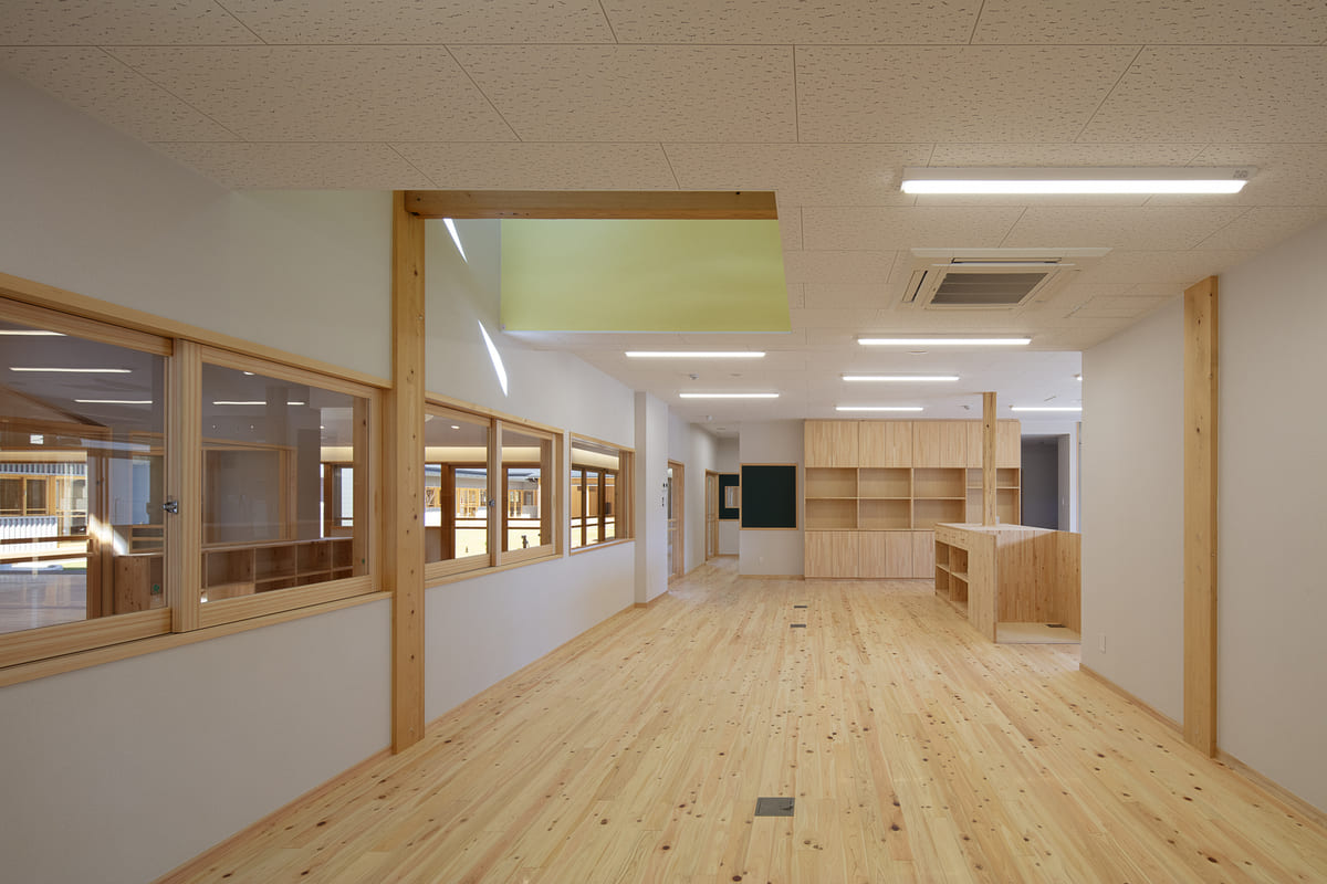 回廊で結ばれたその構成は、見守るまなざしと、駆け回る足音とが交差する、あたたかい空間のリズムをつくり出している。