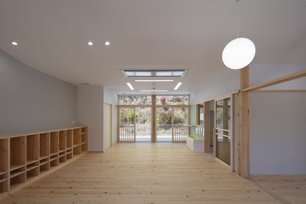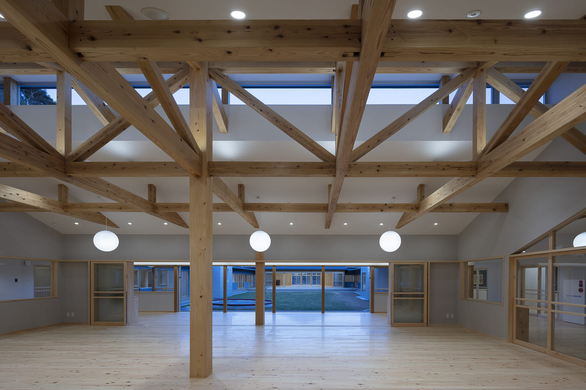 「おひさまホール」は、園全体の象徴として方形屋根の大空間で設けられ、群建築の中でも求心性を持つ場となっている。